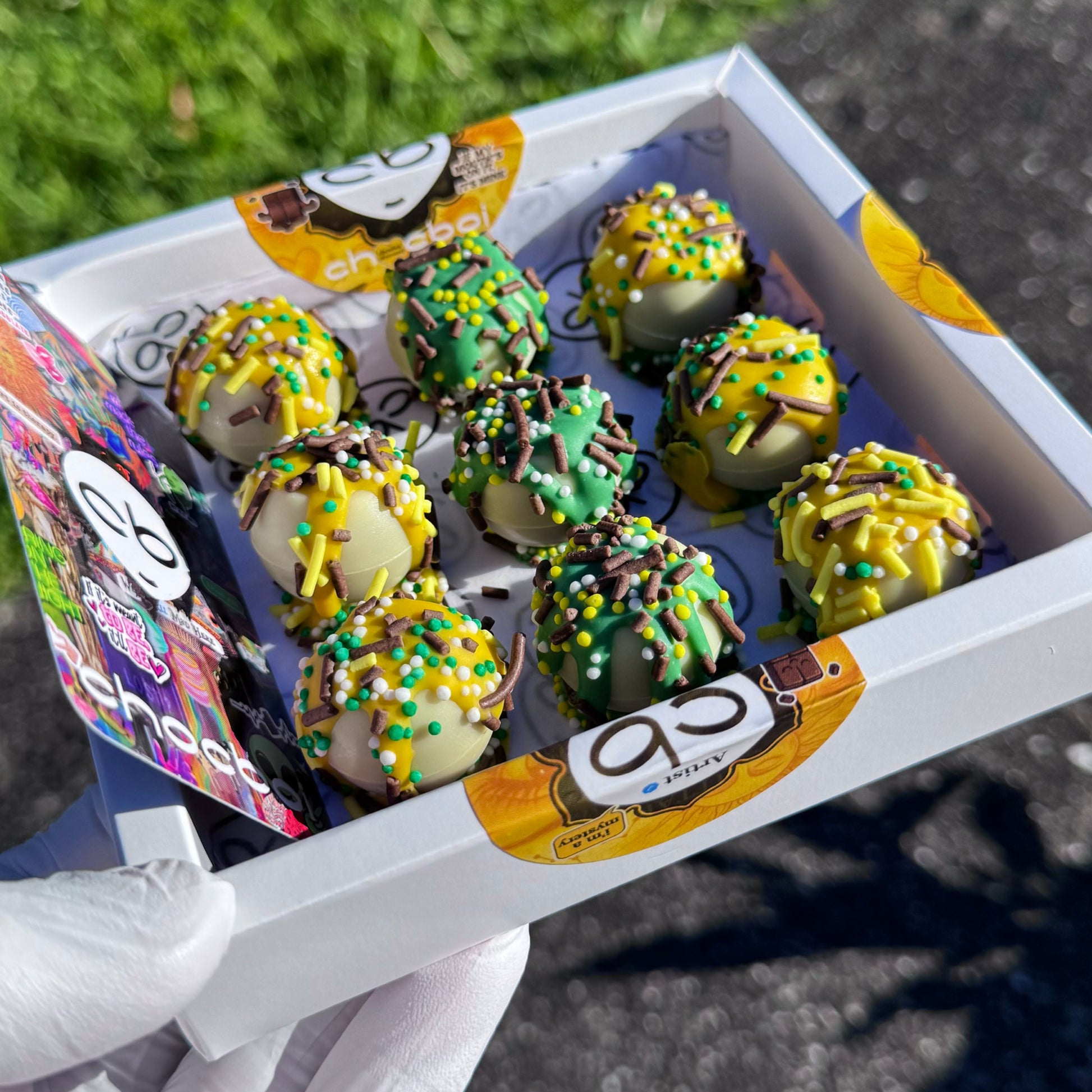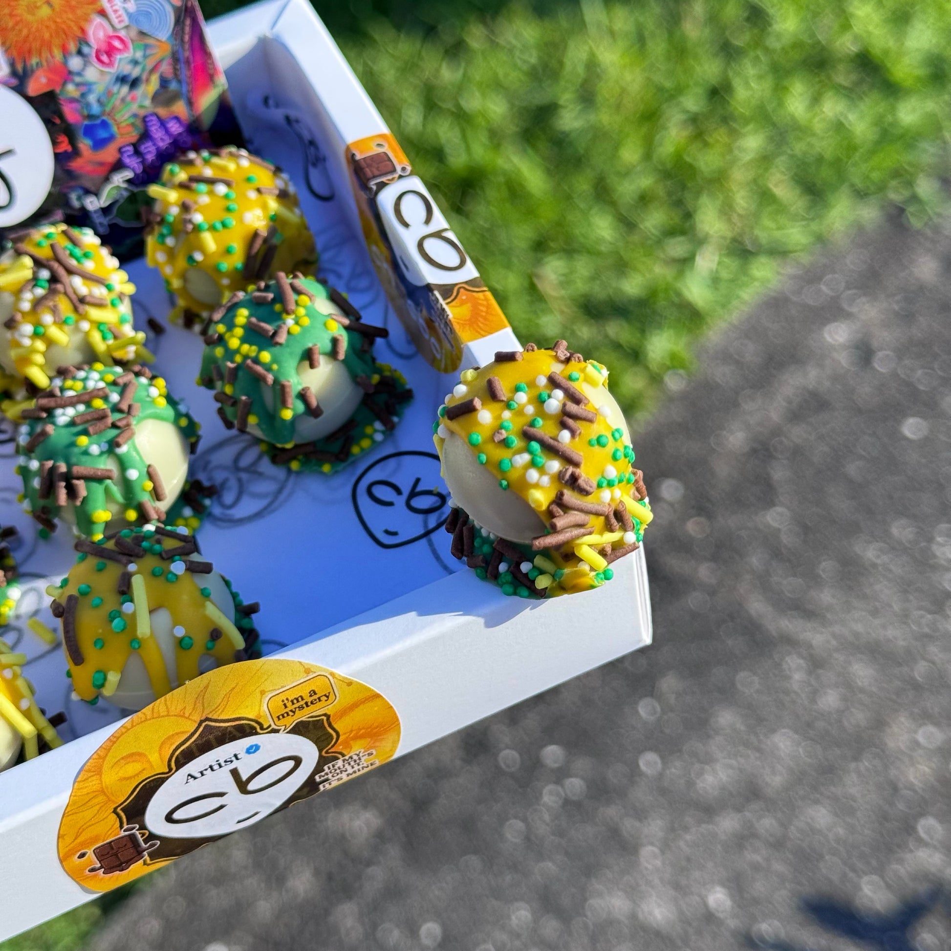 Each Paradise Pineapple Lump Chocbite is hand-crafted with milk chocolate, filled with a fresh pineapple jam and milk chocolate ganache. inspired by the iconic lolly. Finished with a tropical sprinkle crunch, these bites bring nostalgia, colour, and pure happiness in every mouthful.